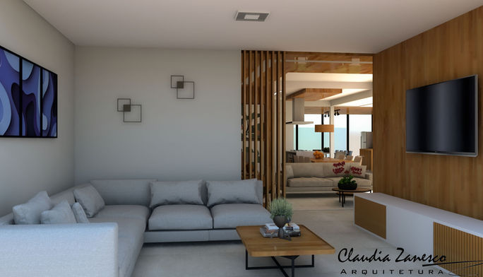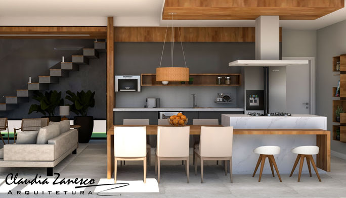 Uma casa e moderna, setorizada, com ambientes reservados, prevaleceu a tendência atual, a cor cinza, os elementos amadeirados estão presentes, e um leve toque de cores em elementos decorativos para aquecer os ambientes.